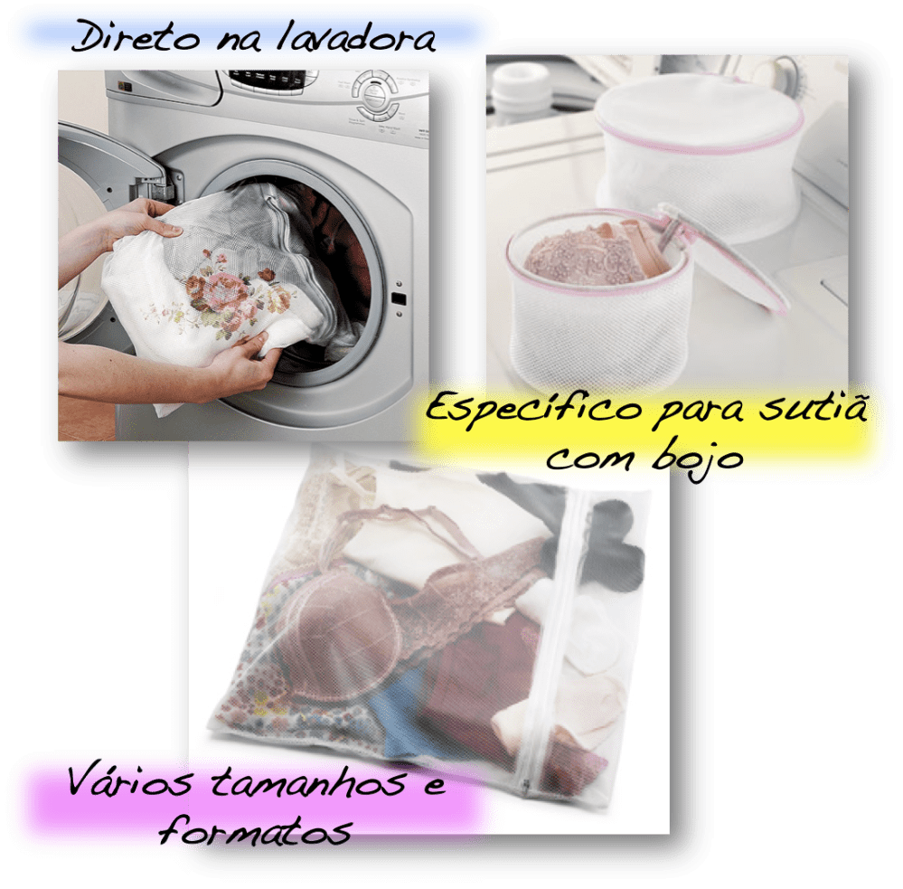Minha mãe descobriu há alguns anos uns saquinhos para lavar roupas delicadas em lavadoras e não estragá-las. São saquinhos importados do Japão ou da China que são uma verdadeira maravilha! Você coloca as suas peças dentro do saquinho e elas ficam protegidas na lavadora. Existem vários tamanhos e formatos e, inclusive, um específico para sutiãs com bojo. Quando fomos para o Japão (Minha mãe e eu) compramos muitos nas lojas que vendem tudo a 1 ien! Aqui em São Paulo é possível encontrar no bairro da Liberdade, na loja Tenman-ya, na Rua dos Estudantes, 19. A loja é uma loucura! Tem muita coisa importada de deixar qualquer um doido pra levar a loja!