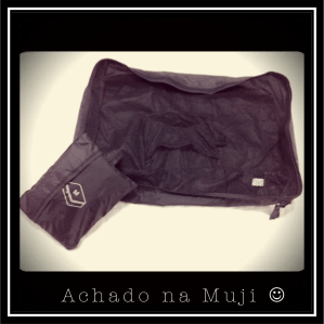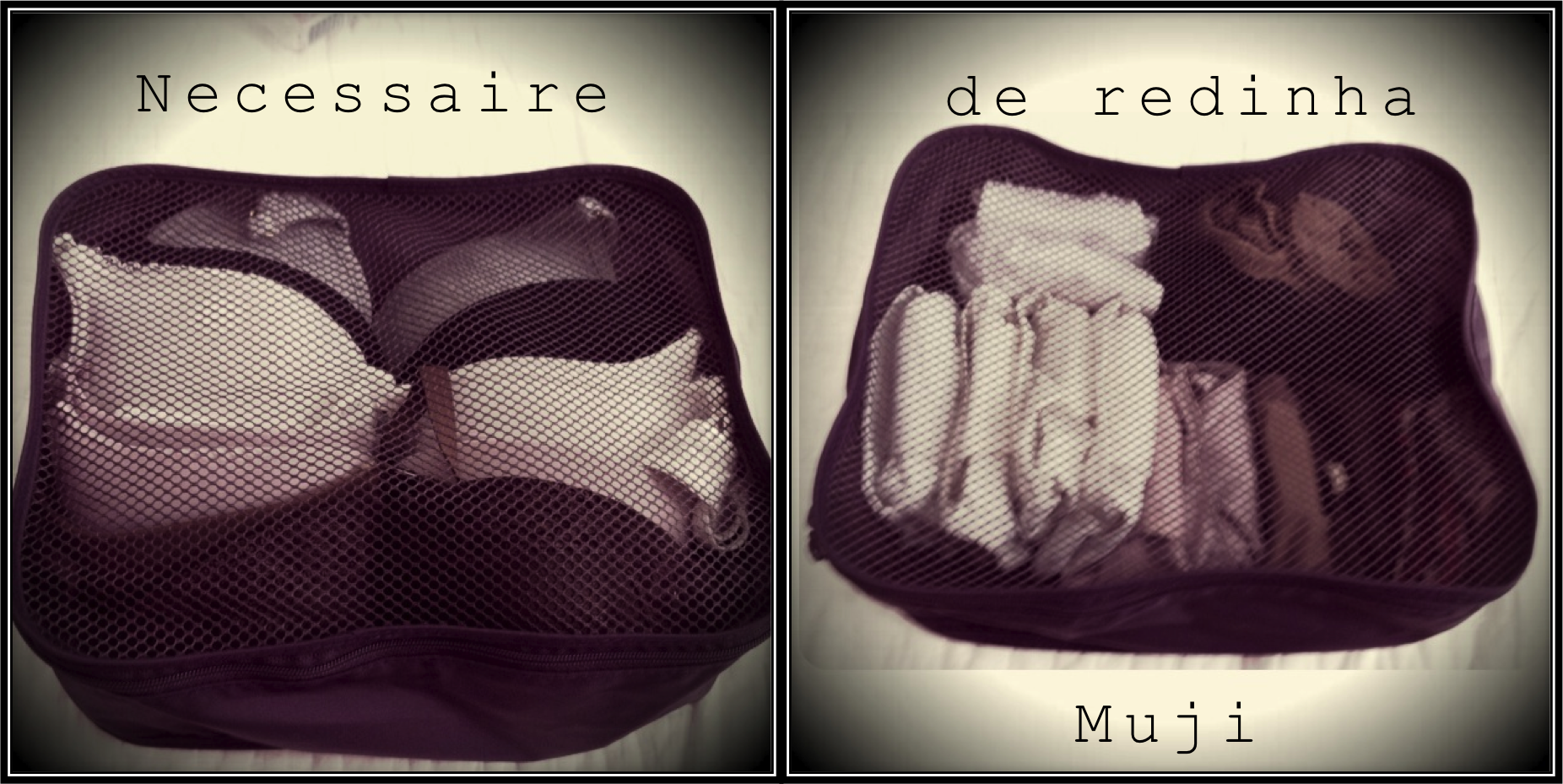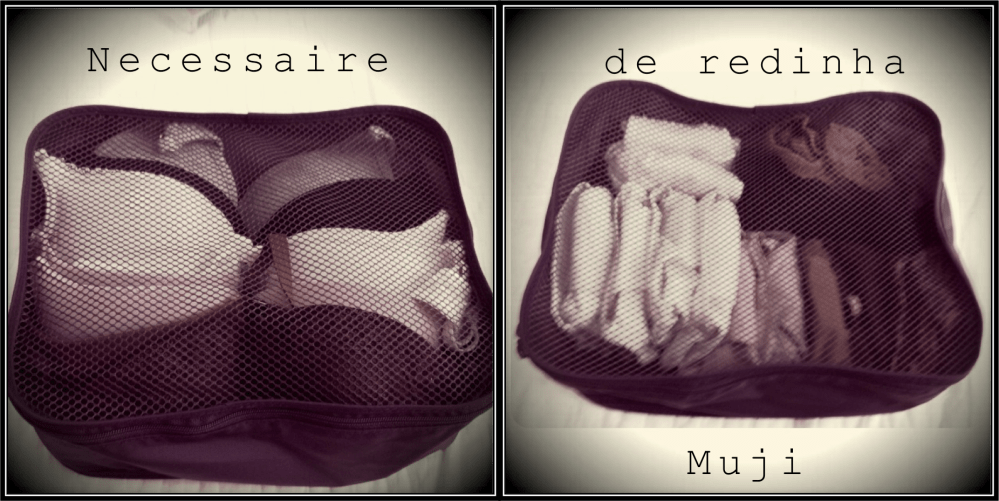 # Lingerie e meias – sempre foram um problema para mim e nunca me ajeitei bem. A Muji resolveu os meus problemas. As necessaires de redinha tamanho P são sensacionais! Organizo em uma os meus sutiãs e na outra, as minhas calcinhas. Se você não vai precisar de muitas calcinhas, ainda cabem meias na mesma necessaire. As calcinhas coloco todas dobradinhas em formato envelope e as meias também (ver como dobrar aqui e aqui). Você também pode pegar uma necessaire para meias curtas e meia calça. Aliás, mesmo que você não tenha essa necessaire da Muji, pode adaptar e colocar a sua lingerie e meias em outras que cumpram a mesma função ou similar. Super recomendo deixar tudo organizado. Uma das vantagens desta da Muji, além do formato ideal para encaixar bonitinha na mala, é a redinha que permite você identificar facilmente na mala o que está dentro. Ah, ela também não rouba espaço na mala, pois é feita de um material bem fininho.