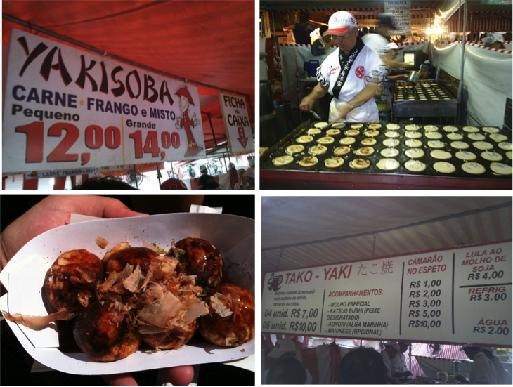Bom, o que eu acho legal é provar algumas comidinhas japonesas que não se encontra em restaurantes. Por exemplo, o Tako Yaki, um bolinho de polvo, típico do Japão. Tem também de camarão, embora o típico seja de polvo. Comi lá em Osaka no Japão e quando vi na Liberdade, não resisti. Você também encontra os tradicionais Guioza e Tempurá.